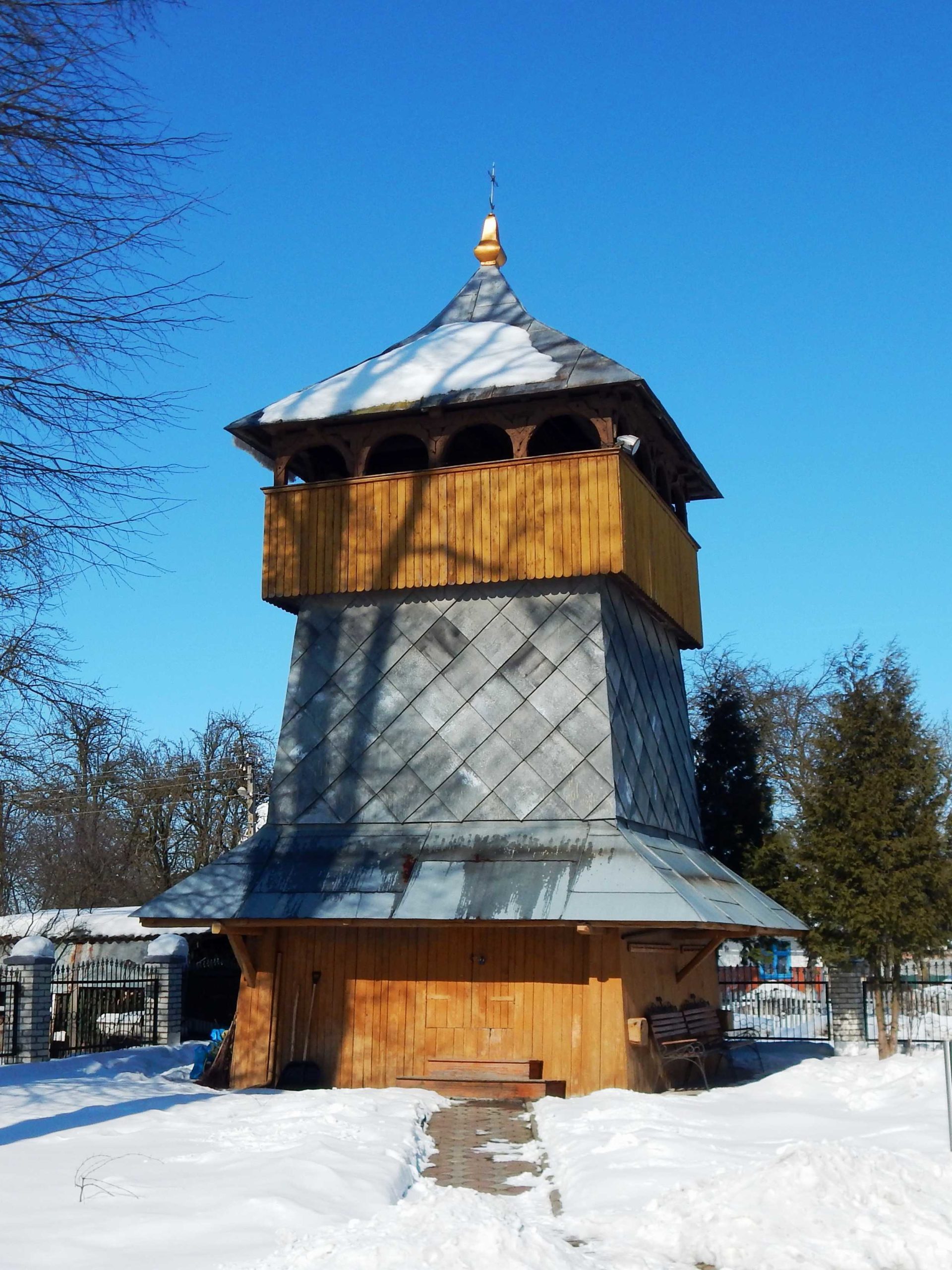 Дзвіниця розміщена з північно-західної сторони від церкви. За своїми формами є триярусною оборонного типу з арковою галереєю, накрита шатровим дахом.