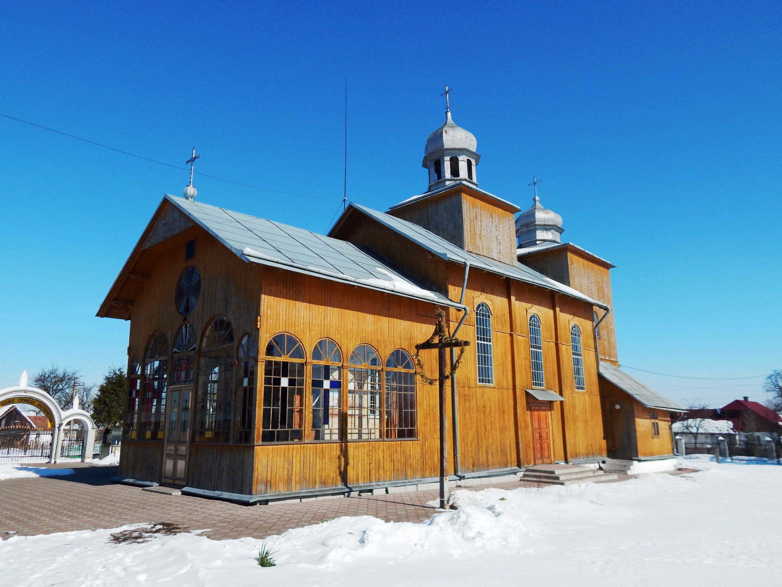 Храм двоверхий, вівтарна частина накрита пірамідальним дахом з глухим ліхтарем, з якого відходить металева вентиляційна труба, і маківкою. З двосхилого даху нави здіймається чотирикова вежа, завершена прозорим ліхтарем. Бабинець досить великих форм з величезними арочними вікнами. З південного та східного боку від вівтаря прибудовані ризниці.