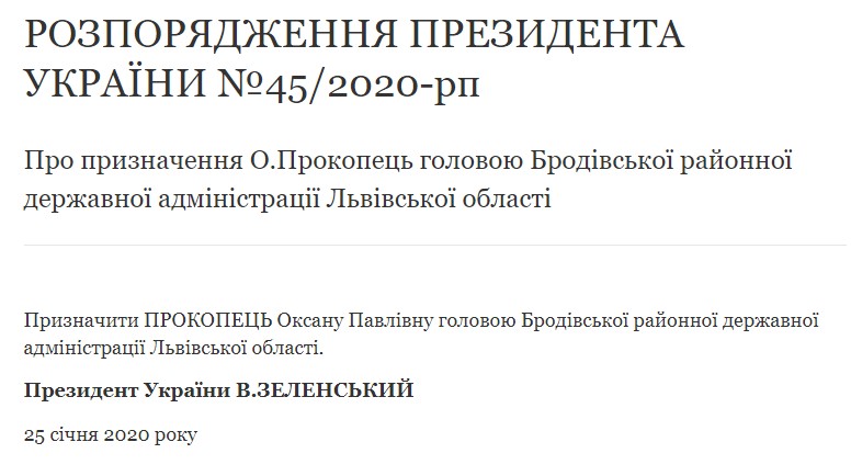 Президент України Володимир Зеленський призначив Прокопець Оксану Павлівну головою Бродівської районної державної адміністрації Львівської області.