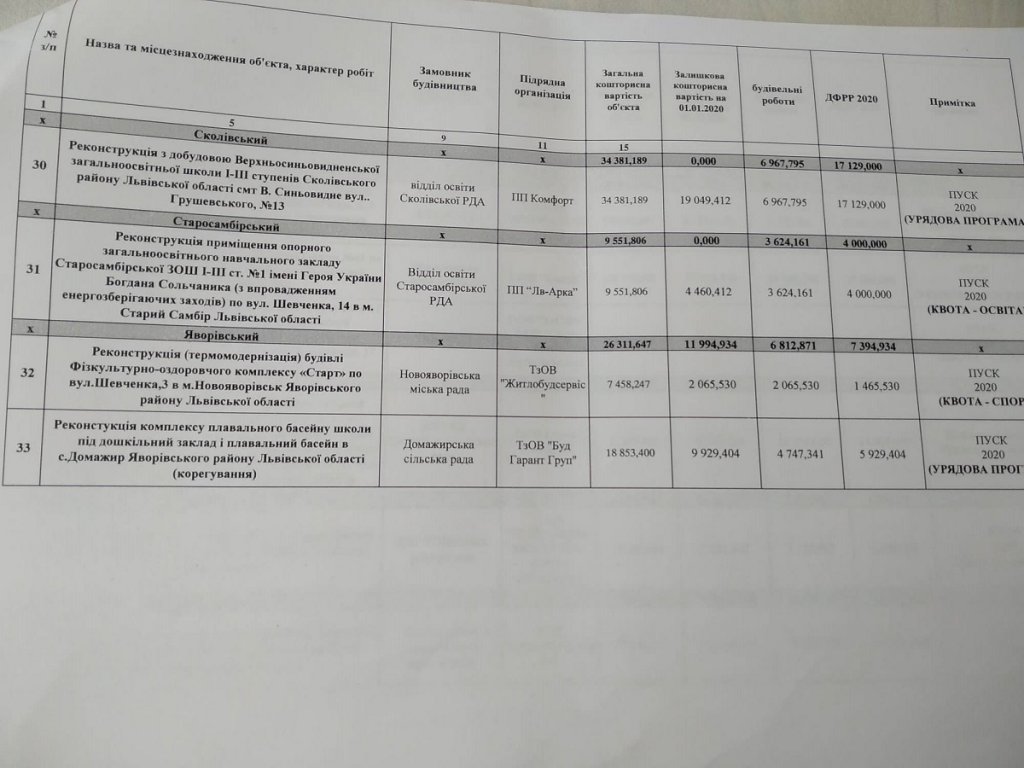 • Реконструкція приміщення опорного загальноосвітнього закладу Старосамбірської ЗОШ I-III ст. №1 імені Героя України Богдана Сольчаника (з впровадженням енергозберігаючих заходів) по вул. Шевченка, 14 в м. Старий Самбір Львівської області. – виділяється з ДФРР 4 000, 000 млн. грн., де замовником будівництва виступає Відділ освіти Старосамбірської РДА.