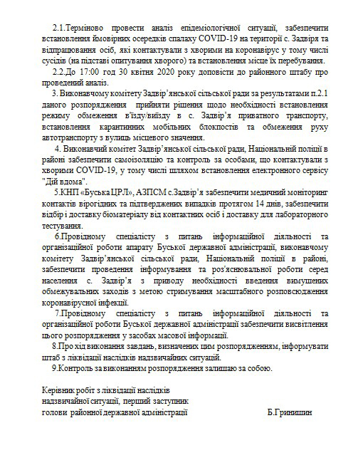 – Терміново провести аналіз епідеміологічної ситуації, забезпечити встановлення ймовірних осередків спалаху COVID-19 на території с. Задвіря та відпрацювання осіб, які контактували з хворими на коронавірус у тому числі сусідів (на підставі опитування хворого) та встановлення місце їх перебування.