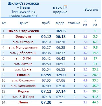 (відправлення зі Шкла о 06:05 – прибуття до Львова о 07:30)