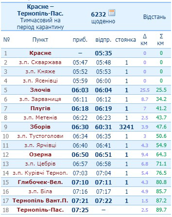 (відправлення із Красного о 05:35 – прибуття до Тернополя о 07:25)