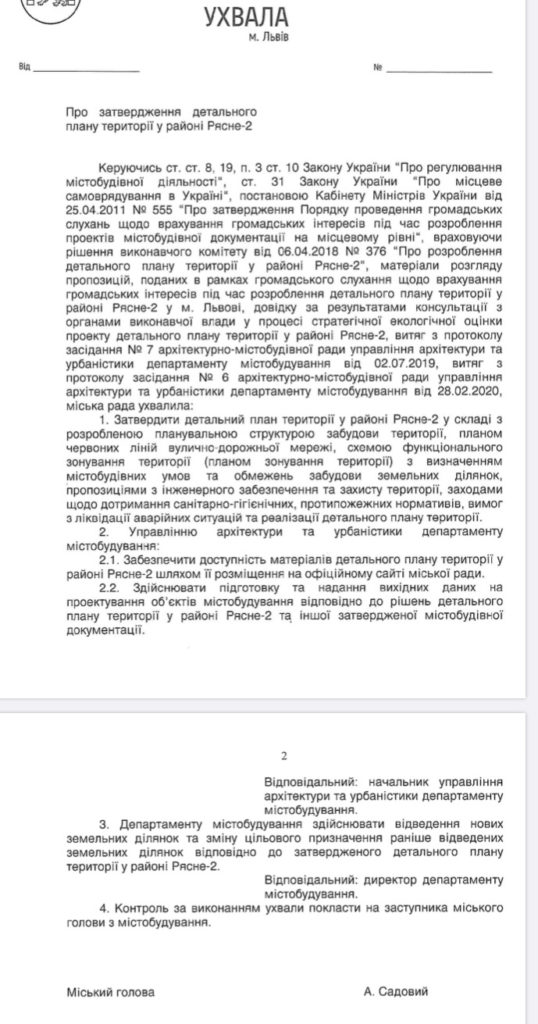 Після обговорень з громадою Рясне 2 на сесію було винесено ухвалу, яка стосується коригування параметрів транспортної розв’язки та передбачається комунальний басейн. Також, ухвала реалізовує звернення власників земельних ділянок, для повноцінного використання. На зауваження громади мікрорайону, які озвучила депутатка Мар’яна Батюк, що в плані проектованої дороги у Рясну-Руську вже збудовані багатоповерхівки ЖК Соняшник, доповідач Антон Коломойцев відповів, що дорога в межах червоних ліній і проходитиме повз зведені будинки. Ухвалу підтримали 46 депутатів ЛМР.