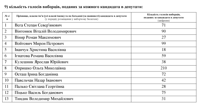 – Опришко Ольга Миколаївна (Самовисування) – 210 голосів