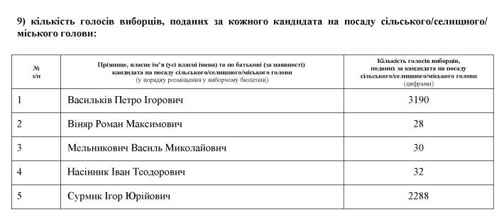 1. Васильків Петро Ігорович (Самовисування) – 3190 голосів | 57,29%