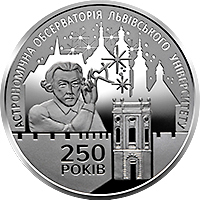 Пам’ятна монета “250 років Астрономічній обсерваторії Львівського університету” номіналом 5 грн, виготовлена з нейзильберу, масою 16,54 г, діаметром 35 мм. Тираж випуску становить 35 тис. штук.