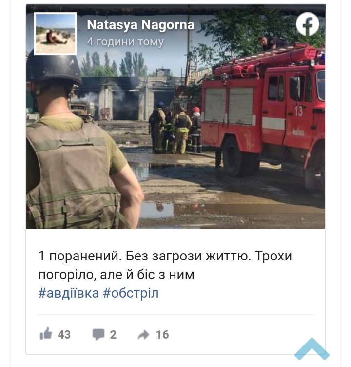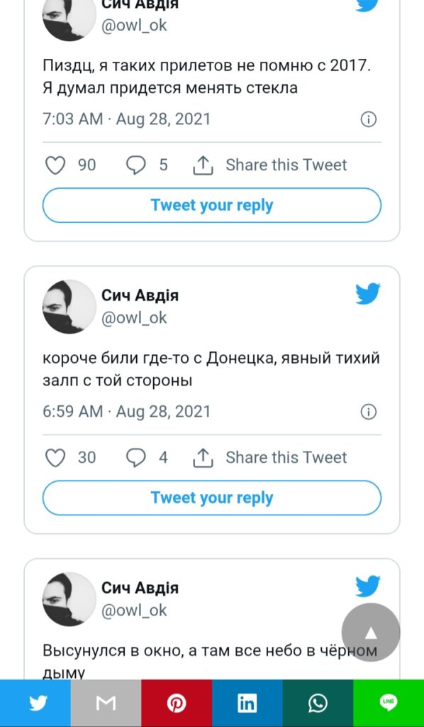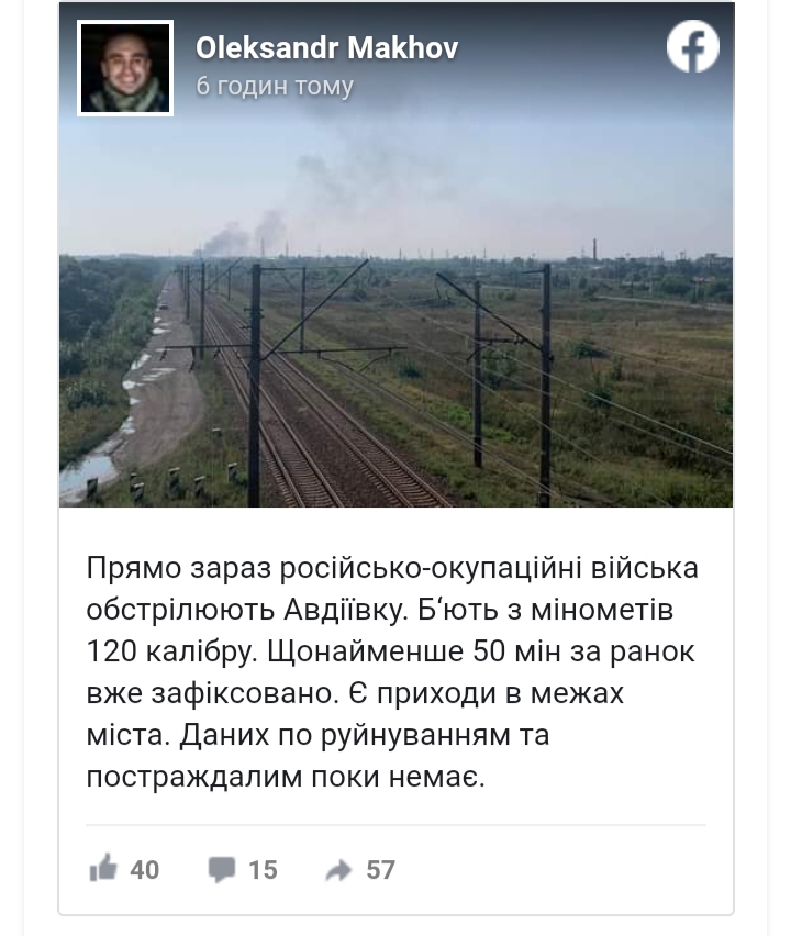 Про обстріл Авдіївки пишуть також місцеві жителі у соціальних мережах. “П…здець, я таких прильотів не пам’ятаю з 2017-го. Я думав, доведеться міняти скло”, – написав один із користувачів Twitter.