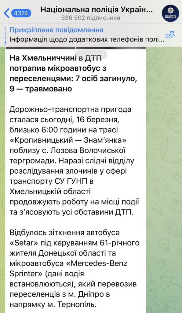 Як повідомляє пресслужба Нацполіції, сьогодні, 16 березня, близько 6 години поблизу села Лозова на Хмельниччині сталася ДТП з мікроавтобусом із переселенцями. Внаслідок ДТП водій та 6 пасажирів мікроавтобуса загинули на місці.