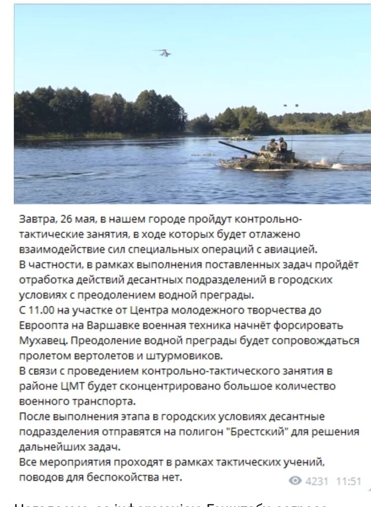 Про це повідомив голова Брестського міського виконавчого комітету Олександр Рогачук. Він попередив, що у зв’язку з проведенням заняття в районі Центру молодіжної творчості (ЦМТ) буде сконцентровано велику кількість військового транспорту.